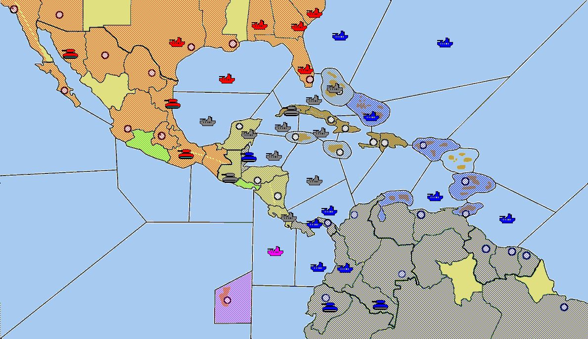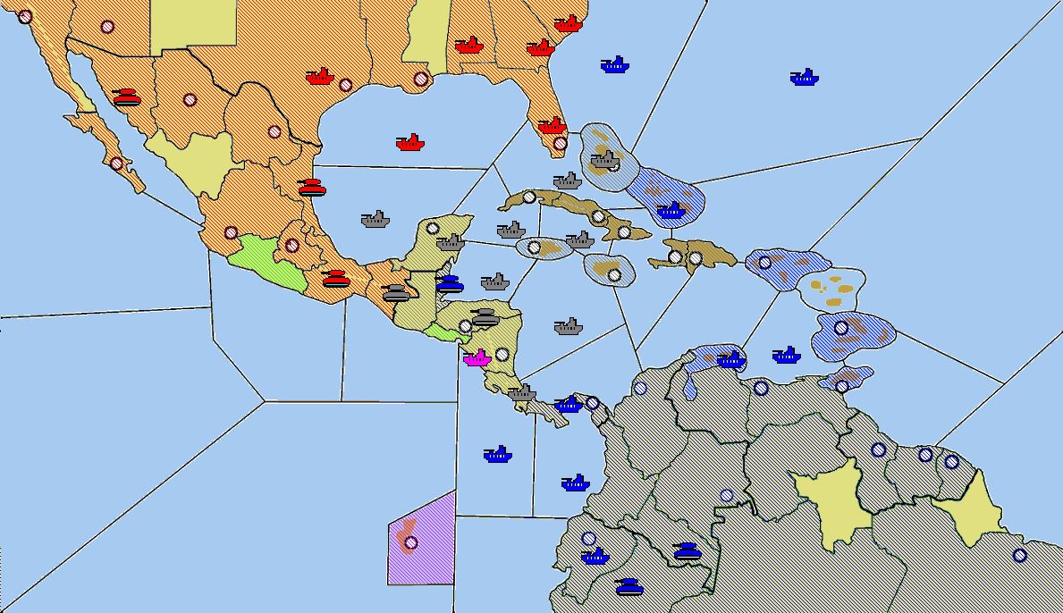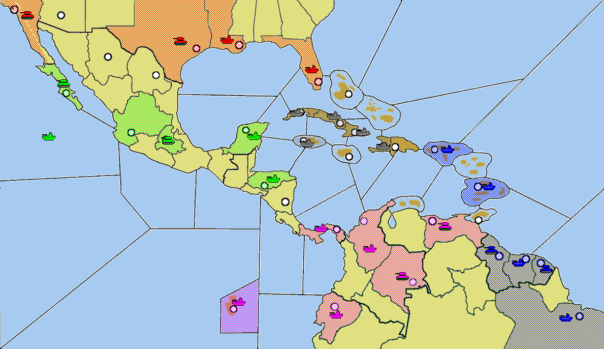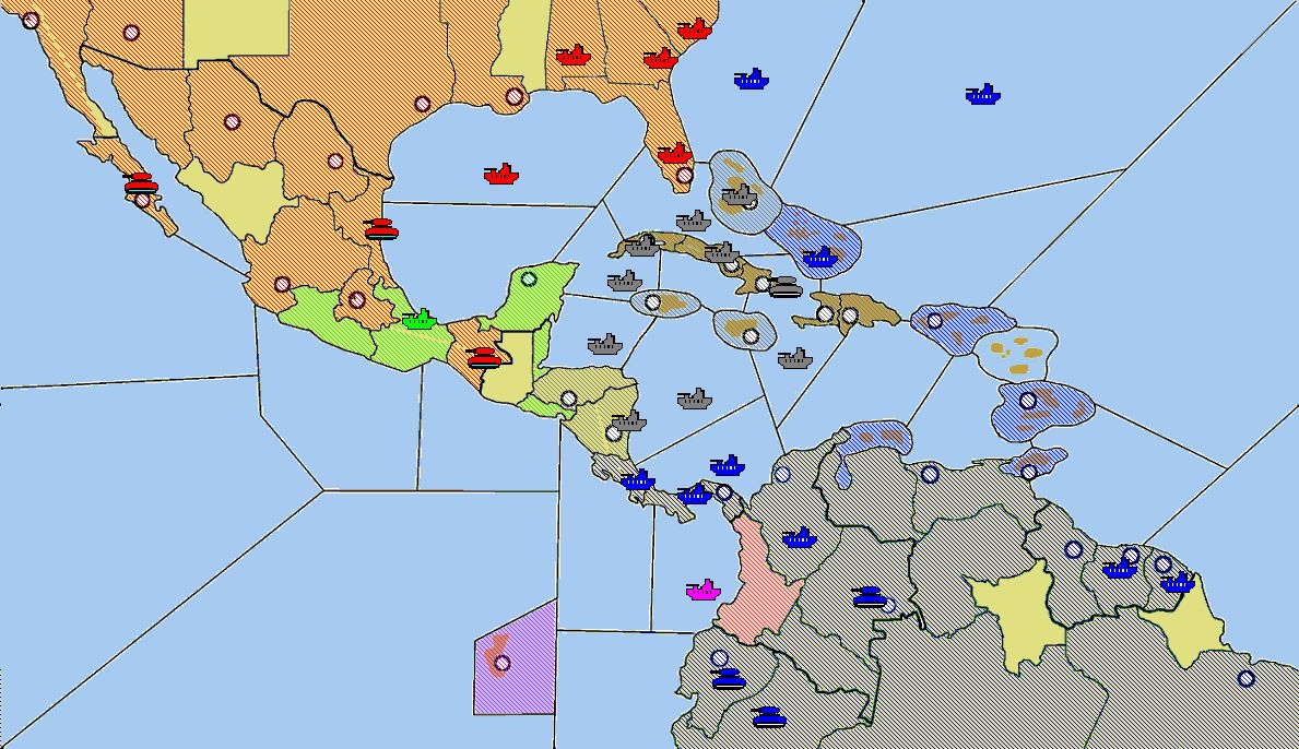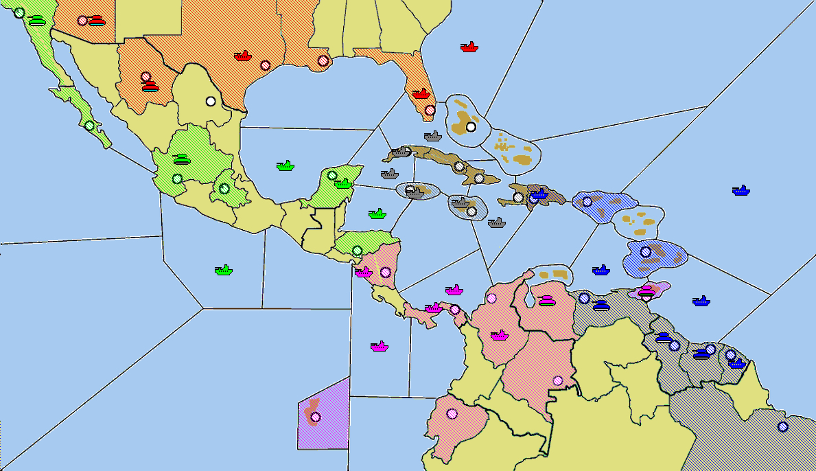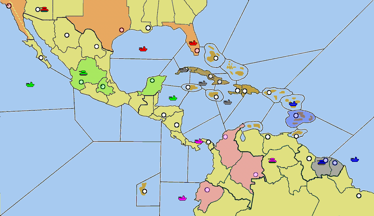 Die Variante Moderne Karibik ist für 5 Spieler angelegt. Die Nationen und Startpositionen sind USA (rot) A Kal - F Tex - F Flo Mexico (grün) F Gdj - A Mex - F Yuc Kuba (grau) F Hav - F Cie(sc) - F San Kolumbien (pink) F Ecu - F Bog - A Vic Frankreich (blau) A FGu - F Sur - F Mat Zu Spielbeginn gilt zu beachten, dass Kubas Flotte in Cienfuegos an der Südküste startet. SIEGKRITERIUM Es gibt insgesamt 34 Versorgungszentren. Somit sind 18 VZs für einen Sieg notwendig. GEOGRAFISCHE BESONDERHEITEN 1) Panama besitzt traditionell einen Kanal. Der Kanal kann nicht in einem Zug durchquert werden. Eine Flotte muss daher zuerst die Provinz Panama einnehmen um im nächsten Schritt in den anderen Ozean ziehen zu können (analog dem Feld Dänemark im Standardspiel). 2) Insgesamt 10 Provinzen (Bahamas, Cook-Inseln, Cayman-Islands, Jamaika, Puerto Rico, Guadeloupe, Martinique, Trinidad/Tobago, Aruba und Galapagos) sind sowohl Land- als auch Seeprovinzen. Eine Flotte, die eine dieser Provinzen besetzt, kann demnach trotzdem einen Convoy einer Landeinheit vornehmen. 3) Die Provinzen Aruba und Trinidad/Tobago können von den angrenzenden Landprovinzen mit einer Armee erreicht werden. 4) Die Provinzen Kalifornien, Veracruz, Chiapas, Nicaragua und Costa Rica haben jeweils eine West- und Ostküste. Die kubanische Heimatprovinz Cienfuegos besitzt eine Nord-und Südküste. |