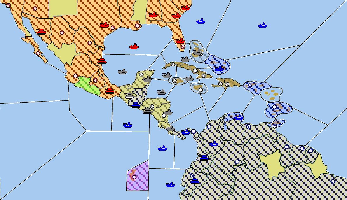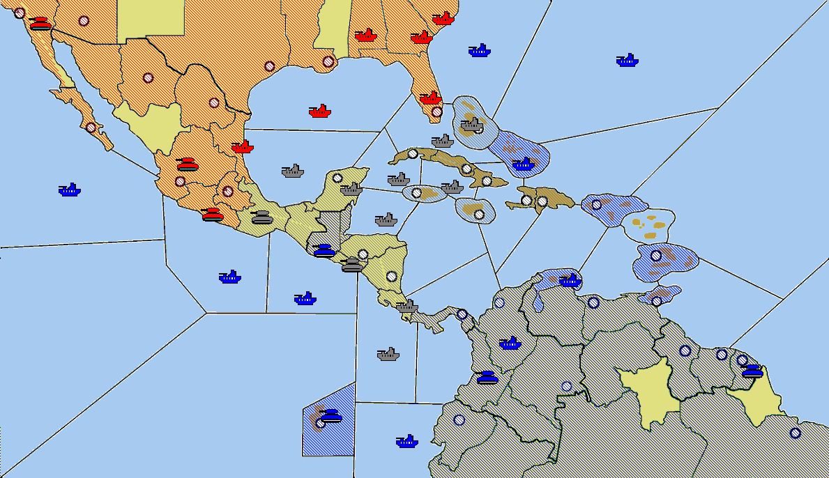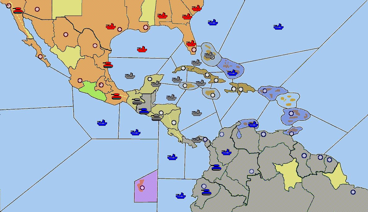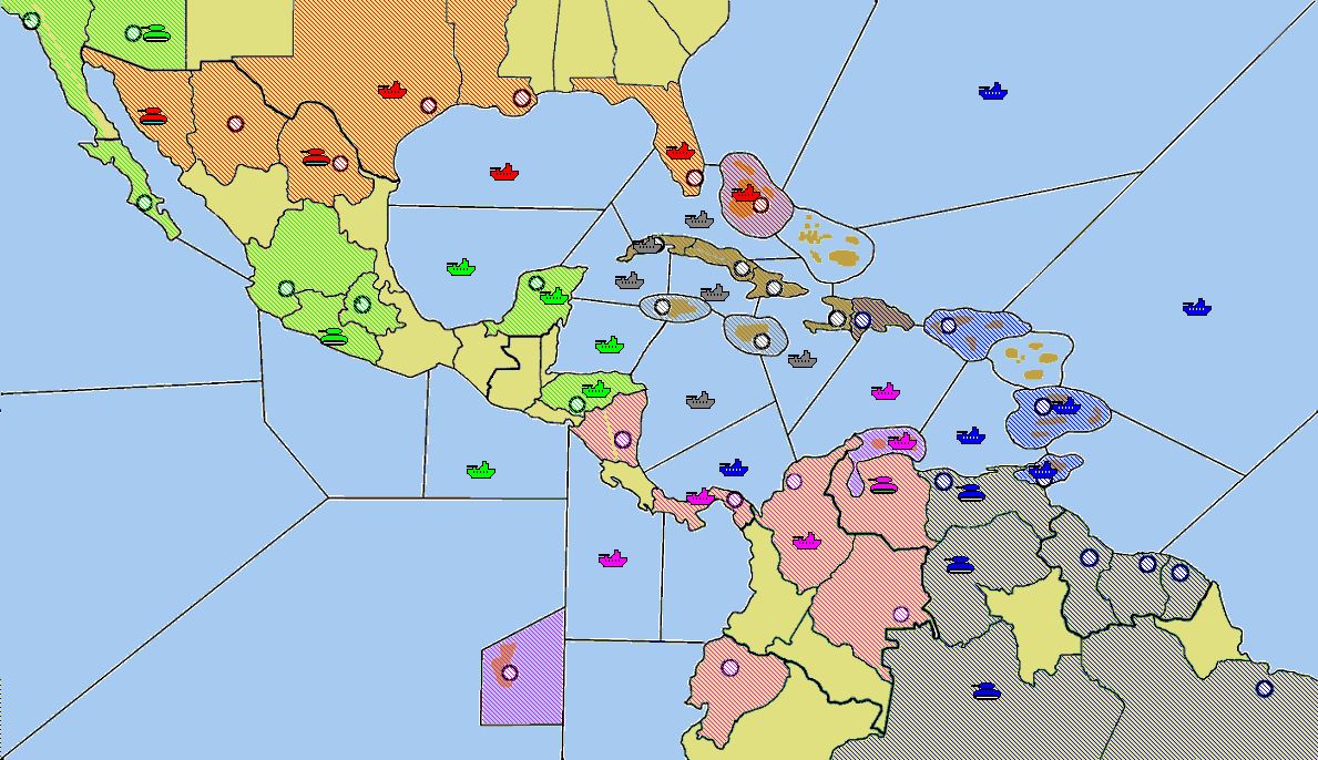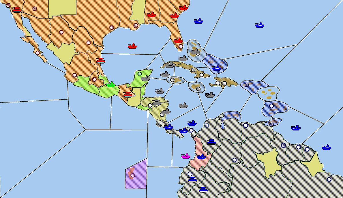 Die Variante Moderne Karibik ist für 5 Spieler angelegt. Die Nationen und Startpositionen sind USA (rot) A Kal - F Tex - F Flo Mexico (grün) F Gdj - A Mex - F Yuc Kuba (grau) F Hav - F Cie(sc) - F San Kolumbien (pink) F Ecu - F Bog - A Vic Frankreich (blau) A FGu - F Sur - F Mat Zu Spielbeginn gilt zu beachten, dass Kubas Flotte in Cienfuegos an der Südküste startet. SIEGKRITERIUM Es gibt insgesamt 34 Versorgungszentren. Somit sind 18 VZs für einen Sieg notwendig. GEOGRAFISCHE BESONDERHEITEN 1) Panama besitzt traditionell einen Kanal. Der Kanal kann nicht in einem Zug durchquert werden. Eine Flotte muss daher zuerst die Provinz Panama einnehmen um im nächsten Schritt in den anderen Ozean ziehen zu können (analog dem Feld Dänemark im Standardspiel). 2) Insgesamt 10 Provinzen (Bahamas, Cook-Inseln, Cayman-Islands, Jamaika, Puerto Rico, Guadeloupe, Martinique, Trinidad/Tobago, Aruba und Galapagos) sind sowohl Land- als auch Seeprovinzen. Eine Flotte, die eine dieser Provinzen besetzt, kann demnach trotzdem einen Convoy einer Landeinheit vornehmen. 3) Die Provinzen Aruba und Trinidad/Tobago können von den angrenzenden Landprovinzen mit einer Armee erreicht werden. 4) Die Provinzen Kalifornien, Veracruz, Chiapas, Nicaragua und Costa Rica haben jeweils eine West- und Ostküste. Die kubanische Heimatprovinz Cienfuegos besitzt eine Nord-und Südküste. |