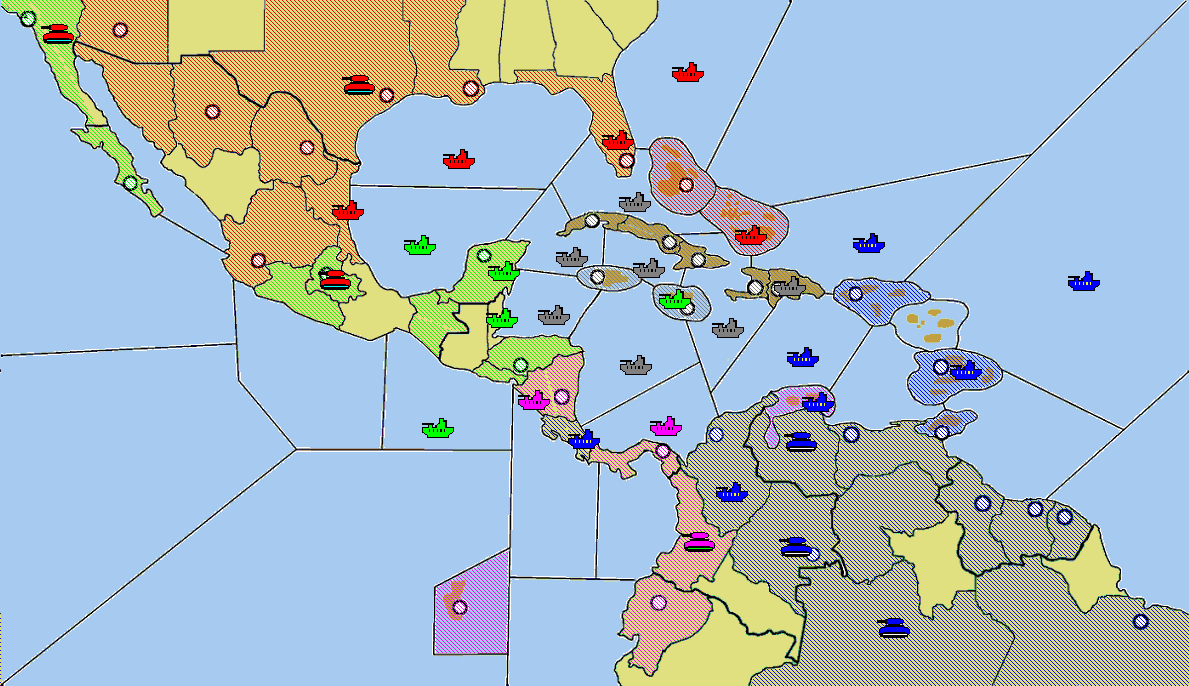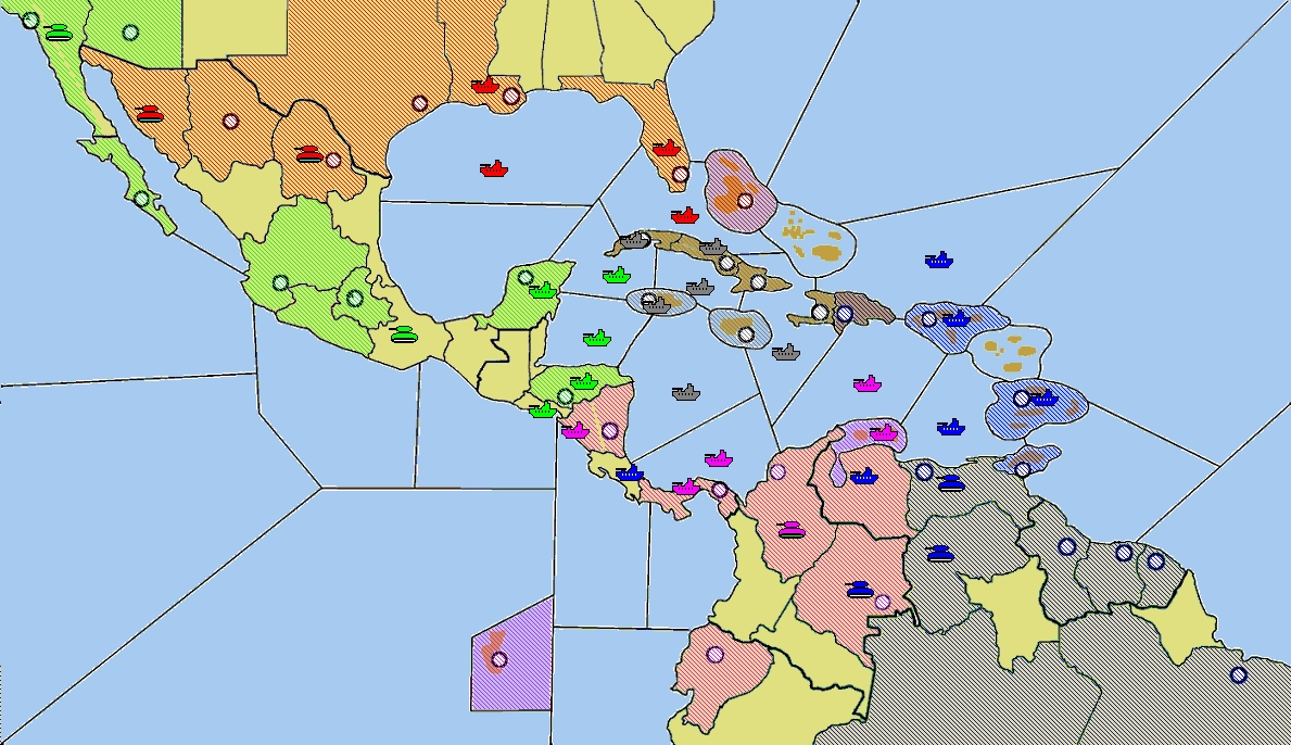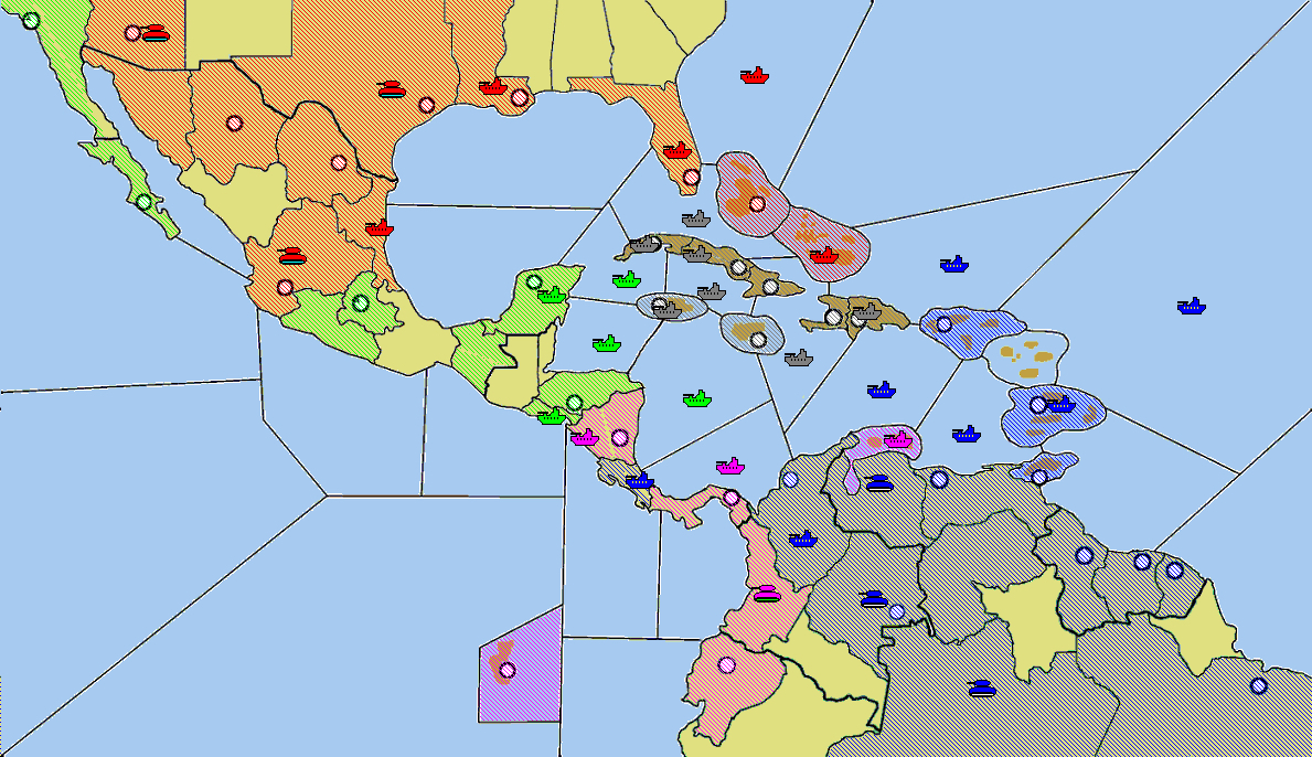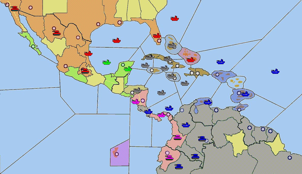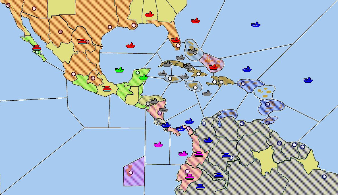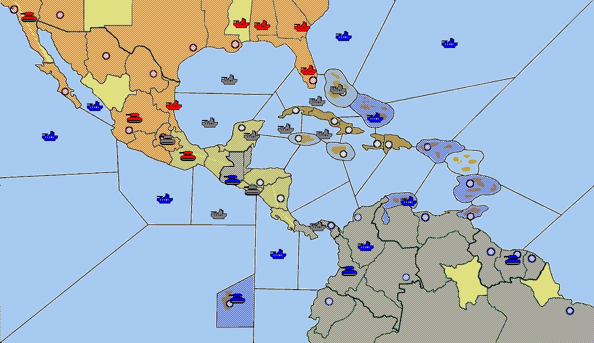 Die Variante Moderne Karibik ist für 5 Spieler angelegt. Die Nationen und Startpositionen sind USA (rot) A Kal - F Tex - F Flo Mexico (grün) F Gdj - A Mex - F Yuc Kuba (grau) F Hav - F Cie(sc) - F San Kolumbien (pink) F Ecu - F Bog - A Vic Frankreich (blau) A FGu - F Sur - F Mat Zu Spielbeginn gilt zu beachten, dass Kubas Flotte in Cienfuegos an der Südküste startet. SIEGKRITERIUM Es gibt insgesamt 34 Versorgungszentren. Somit sind 18 VZs für einen Sieg notwendig. GEOGRAFISCHE BESONDERHEITEN 1) Panama besitzt traditionell einen Kanal. Der Kanal kann nicht in einem Zug durchquert werden. Eine Flotte muss daher zuerst die Provinz Panama einnehmen um im nächsten Schritt in den anderen Ozean ziehen zu können (analog dem Feld Dänemark im Standardspiel). 2) Insgesamt 10 Provinzen (Bahamas, Cook-Inseln, Cayman-Islands, Jamaika, Puerto Rico, Guadeloupe, Martinique, Trinidad/Tobago, Aruba und Galapagos) sind sowohl Land- als auch Seeprovinzen. Eine Flotte, die eine dieser Provinzen besetzt, kann demnach trotzdem einen Convoy einer Landeinheit vornehmen. 3) Die Provinzen Aruba und Trinidad/Tobago können von den angrenzenden Landprovinzen mit einer Armee erreicht werden. 4) Die Provinzen Kalifornien, Veracruz, Chiapas, Nicaragua und Costa Rica haben jeweils eine West- und Ostküste. Die kubanische Heimatprovinz Cienfuegos besitzt eine Nord-und Südküste. |